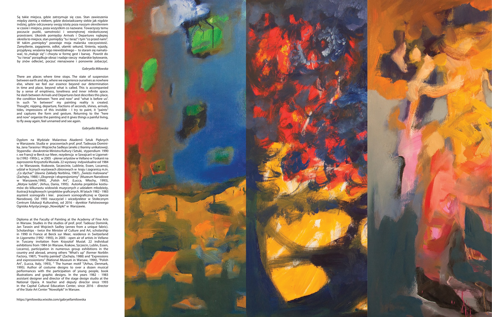 Są takie miejsca, gdzie zatrzymuje się czas. Stan zawieszenia między ziemią a niebem, gdzie doświadczamy siebie jak nigdzie indziej, gdzie odczuwamy swoją istotę poza naszym określeniem w czasie i miejscu, poza wszystkim co nazwane. Towarzyszy temu poczucie pustki, samotności i wewnętrznej nieskończonej przestrzeni. Ukośnik pomiędzy Arrivals i Departures najlepiej określa to miejsce, stan pomiędzy "tu i teraz" i tym "co przed nami". W takim „pomiędzy” powstaje moja malarska rzeczywistość. Zamyślenie, zagapienie, odlot, ułamki sekund, lśnienia, wjazdy, przypływy, wrażenia tego niewidzialnego – to staram się namalować, to „maluje się” i chwyta w formę gest i barwę. Powrót do "tu i teraz" porządkuje obraz i nadaje rzeczy malarskie bytowanie, by znów odlecieć, poczuć nienazwane i ponownie zobaczyć.